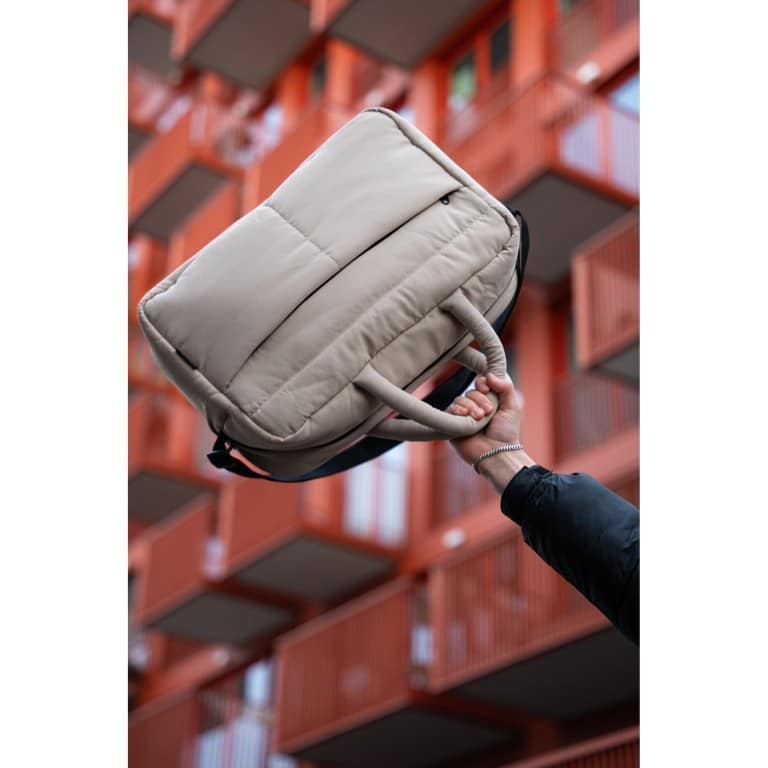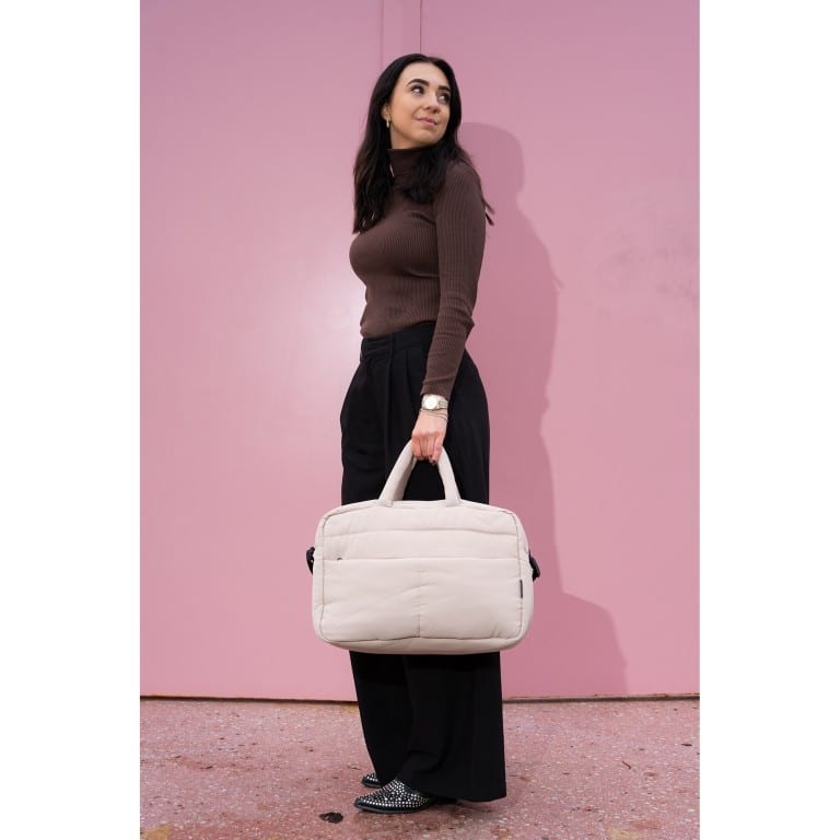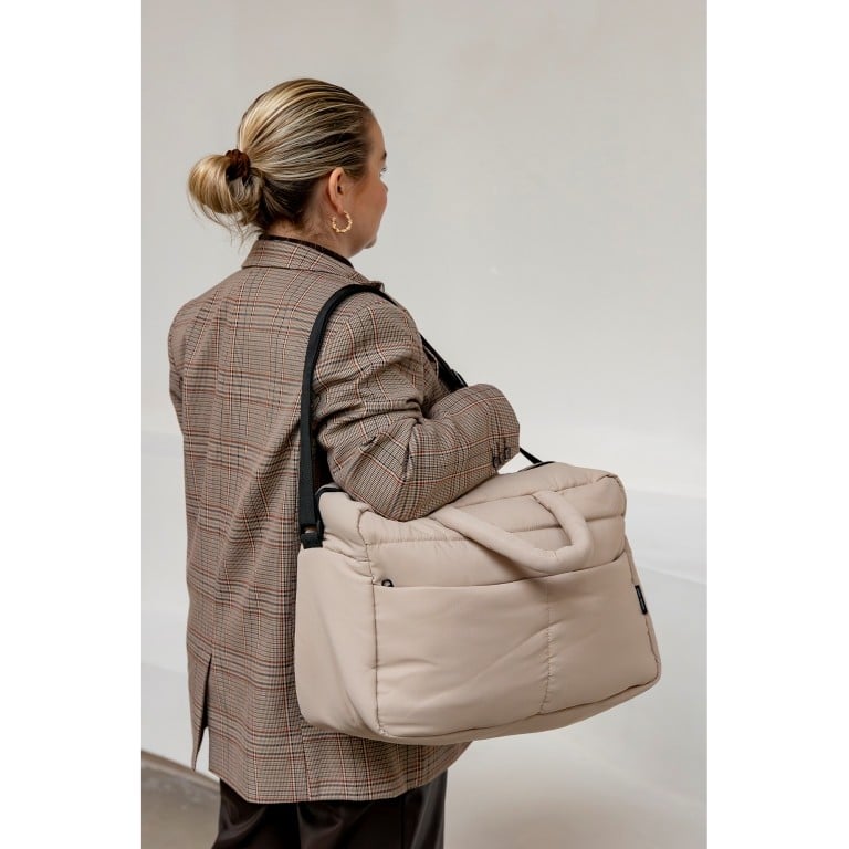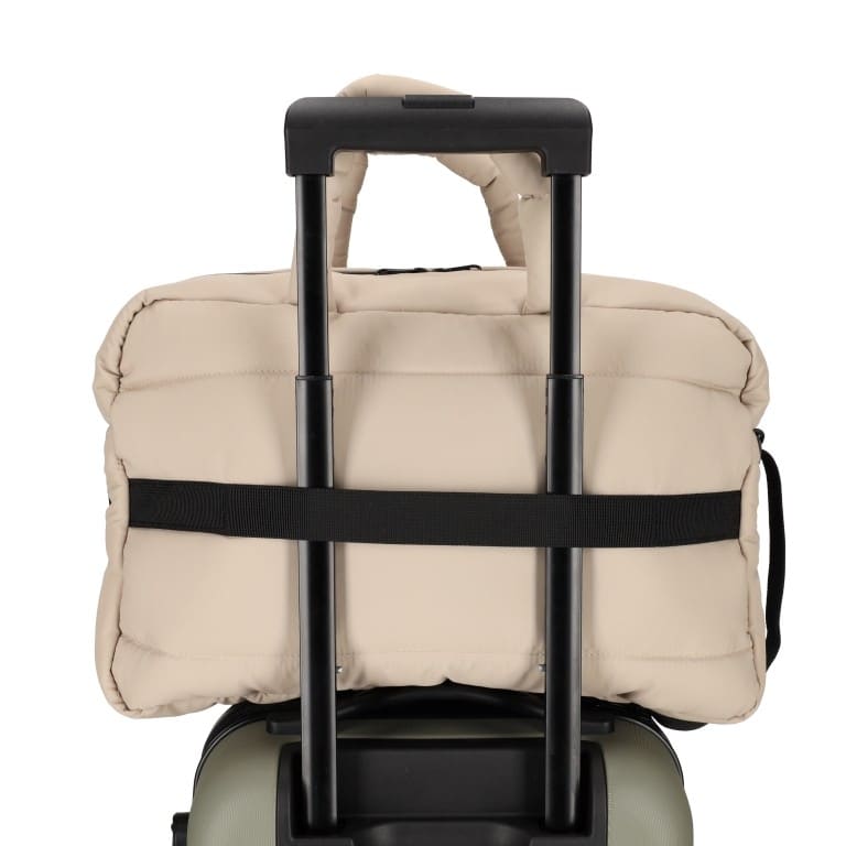 De zachte, gewatteerde afwerking geeft de tas een luxe uitstraling én zorgt ervoor dat je spullen goed beschermd blijven. Dankzij het ruime hoofdvak neem je moeiteloos kleding, schoenen en andere essentials mee. De neutrale taupe kleur maakt de tas tijdloos en makkelijk te combineren met elke outfit.